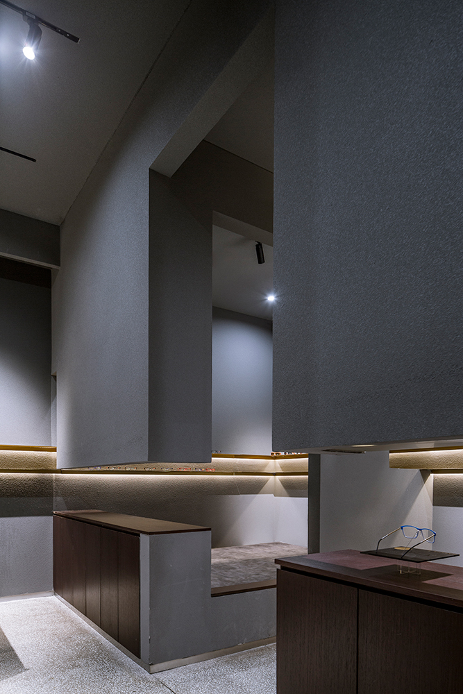 阿目眼镜多年来矢志不渝的在探究专业眼镜的配置,眼镜店的设计延续了这种精神,通过空间的探索和建筑材料来思考眼镜的基本属性。