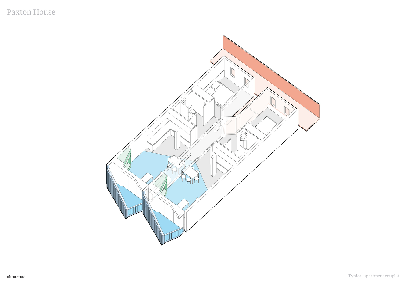 有角度的阳台,以及将入户交通从建筑中半抽离出来的设计,消灭了完全北向的户型,让 Paxton 集合住宅中的每一间公寓都能享受到充足的阳光。