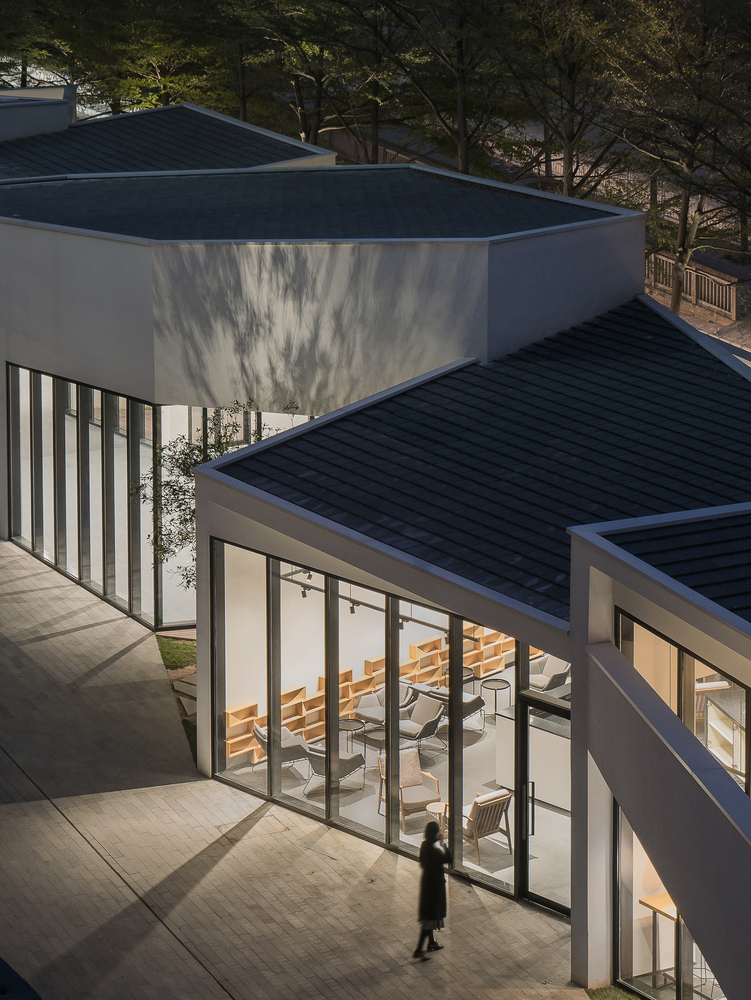 生活美学馆的北面对着高速公路,紧邻北侧是一排保留的小叶榄仁,因此建筑的北界面是高低错落的墙体,既阻挡北边高速公路噪音的影响,同时又能借景小叶榄仁。建筑的南面则是园区的二号办公楼。除了与办公楼底层商业和艺术空间在功能上共同营造休闲娱乐氛围,建筑轮廓和界面也相互对话,形成尺度舒适宜人的步行公共空间。